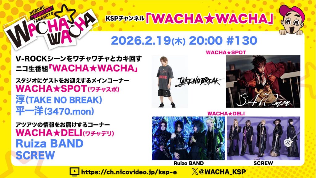 2026年2月19日 ニコニコ生放送 KSPチャンネル『WACHA★WACHA』にRuiza BANDがコメント出演決定!! 2026/02/14 Information ★Ruiza BNADのコメント出演が決定!! ニコニコ生放送 KSPチャンネル『WACHA★WACHA』 2026年2月19日(木) 20:00-21:00生放送 URL → https://ch.nicovideo.jp/ksp-e 番組X→ @WACHA_KSP