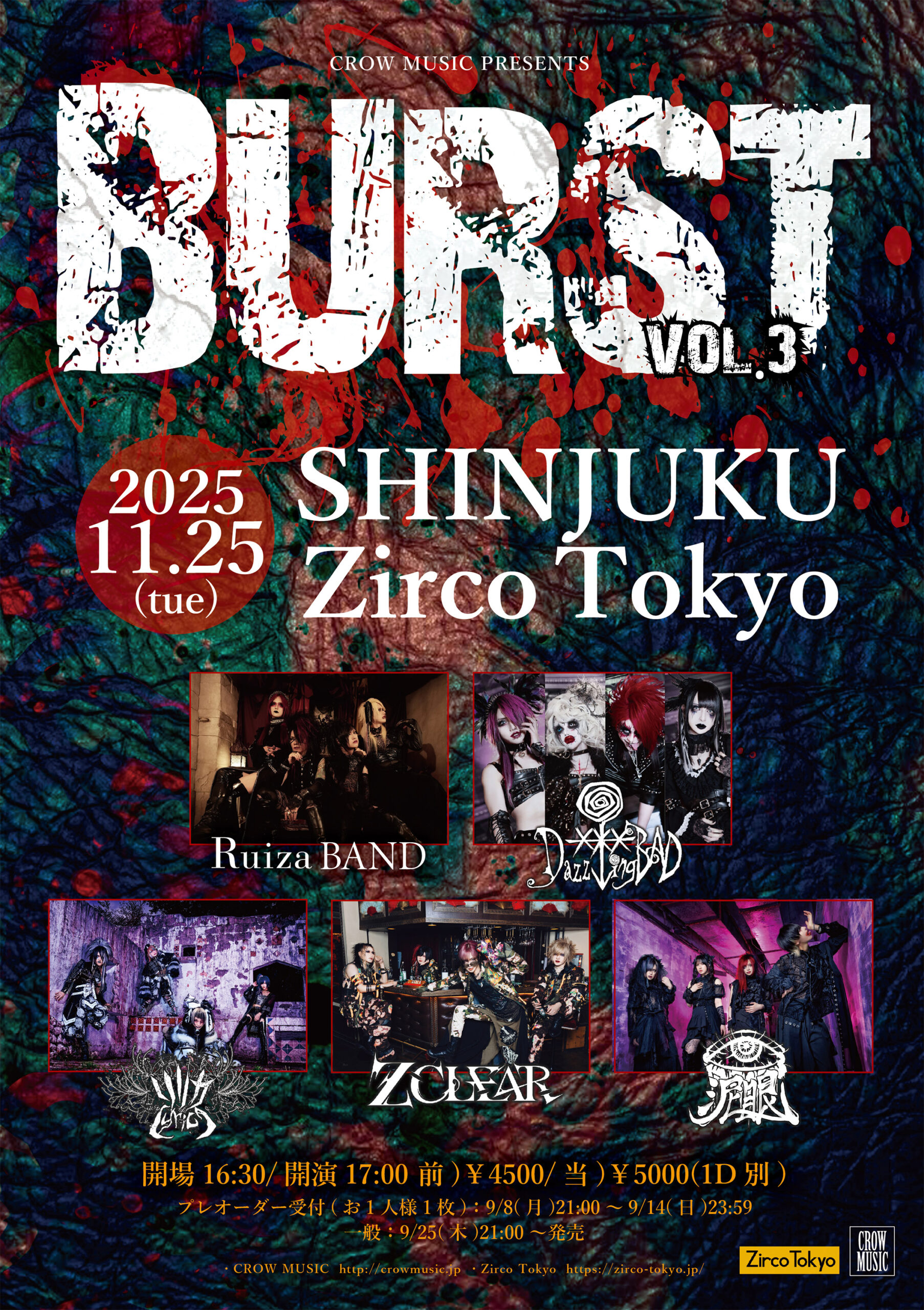 【LIVE】11/25(火) 新宿Zirco Tokyo | CROW MUSIC PRESENTS 「BURST」vol.3 2025/11/25 東京都 新宿Zirco Tokyo Google Map Tickets ◆11/25(火)新宿Zirco Tokyo CROW MUSIC PRESENTS 「BURST」vol.3 開場16:30/開演17:00 前)¥4500/当)¥5000(1D別) 【CAST】Ruiza BAND / DazzlingBAD / 泥眼 / Z CLEAR / リリカ 【チケット】 プレオーダー受付(お1人様1枚):9/8(月)21:00~9/14(日)23:59 https://t.livepocket.jp/e/1psaz LivePocket一般:9/25(木)21:00~発売 【入場順】1.プレオーダー 2.LivePocket一般 3.当日券 【問】Zirco Tokyo:03-6278-9190